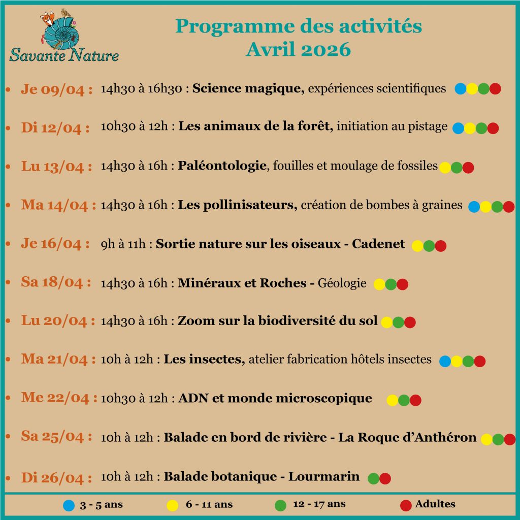Laurène MICHEL, médiatrice scientifique diplômée, vous propose des animations collectives ludiques sur les sciences et la Nature, pour petits et grands, ainsi que des sorties naturalistes en Provence !